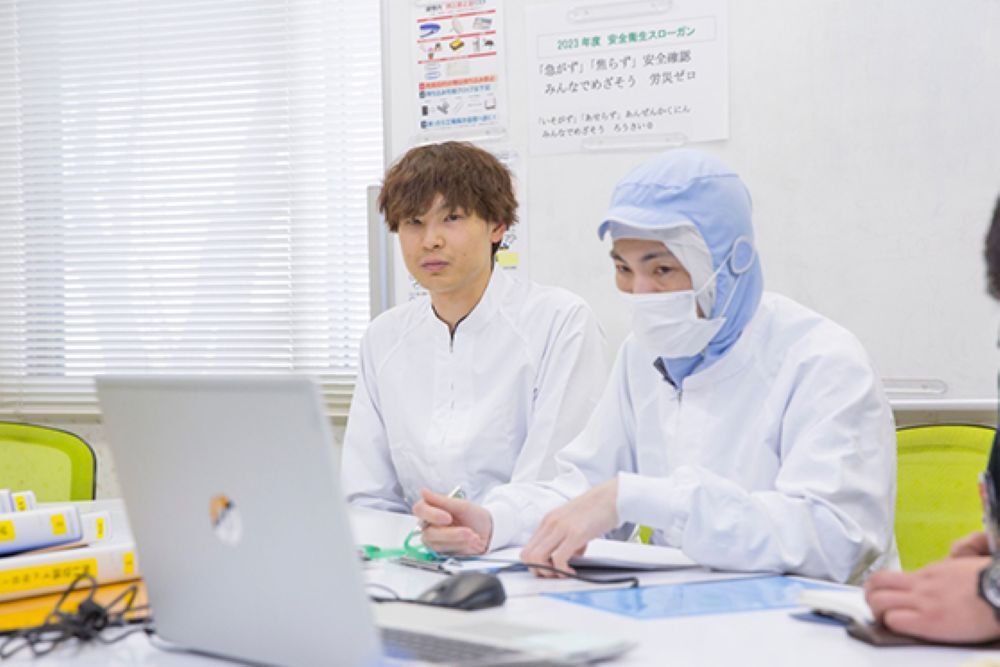 従業員さんや技能職社員の方の作業指示をしたり、配置や能率管理、製造予定の立案、機械のメンテナンスを行っていただきます。初めは先輩社員と一緒にやっていきます。